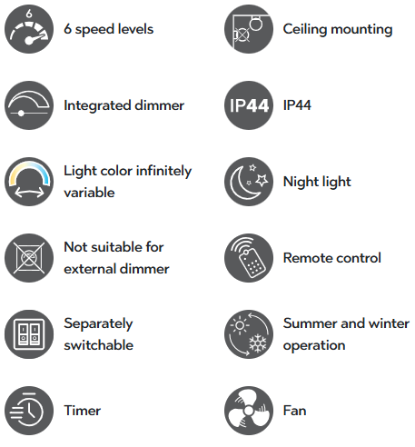 OSLO ventilaator loob ideaalse tasakaalu värske õhu ja atmosfäärilise valguse vahel. See ühendab meeldiva õhuringluse moodsa valgustusega, tagades mugava toakliima aastaringselt. Tänu praktilisele riputusklambrile on laeventilaatori paigaldamine kiire ja lihtne – ilma suurema vaevata. IP44 kaitseklassiga OSLO sobib ideaalselt mitte ainult elutubadesse, vaid ka niisketesse ruumidesse, näiteks vannitubadesse, või õues kasutamiseks, näiteks kaetud terrassile. Kuumadel suvepäevadel pakub see meeldivalt jahedat tuuleiili, õhtutundidel aga just paraja hulga valgust. Valgust ja ventilaatorit saab eraldi lülitada ja mugavalt kaugjuhtimispuldi abil juhtida. Olgu selleks heledus, valguse värvus või õhuvool – kõik on individuaalselt reguleeritav. Ventilaatoril on kuus kiiruseastet, praktiline taimerifunktsioon ja diskreetne öövalgus, mis loob lõõgastava atmosfääri. Moodsat disaini täiendab kvaliteetse plasti ja alumiiniumi elegantne kombinatsioon, mis muudab ventilaatori stiilseks pilgupüüdjaks igal laepinnal. Lisaks on valgustitel kaasaegne LED-tehnoloogia, mis tähistab kõrget valguse kvaliteeti. LED-valgusallikaid iseloomustab pikk kasutusiga ja madal soojuseraldus.