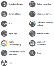 Dünaamilisus, mida on näha ja tunda! SVAERHOLT ventilaator on ümmargune, moodne ja tõeline pilgupüüdja laes. Selle selge disain loob ideaalse lava dünaamilisele valgusele (Dynamic Light), mis täidab ruumi soovi korral atmosfääriliste valgusmaailmadega ja annab ventilaatorile erilise kohaloleku. See muudab funktsionaalse igapäevase abilise tõeliseks disainiavalduseks. Heledust ja valguse värvi saab kaugjuhtimispuldi abil individuaalselt vastavalt teie vajadustele reguleerida - soojast ja hubasest kuni selge ja ergutavani. Ventilaatorit saab valgusest sõltumatult sisse ja välja lülitada ning see pakub peenhäälestusvõimalust 5 kiirusetasemel, nii et õhuringlus on täpselt hetkega kohandatud. Integreeritud öövalgusti pakub õrna juhatust vaikseteks tundideks, samas kui taimerifunktsioon toob igapäevaellu täiendavat mugavust. Mustvalgest plastikust valmistatud SVAERHOLT ühendab moodsad kontrastid selge ja ajatu välimusega. Lisaks on valgustitel kaasaegne LED-tehnoloogia, mis tähistab kõrget valguse kvaliteeti. LED-valgusallikaid iseloomustab pikk kasutusiga ja madal kuumenemiskiirus.
