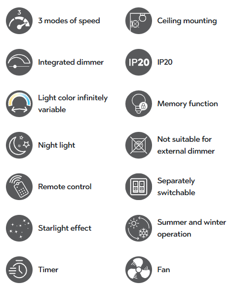 Lihtsalt praktiline - VISBY laevalgusti integreeritud ventilaatoriga! Trendika tähevalgustusega valgusti on ümara välimusega ja tõeline universaalne valgusti, mis võimaldab luua just sellise valguse, nagu tuju soovib. Valgust saab kaugjuhtimispuldi abil hämardada ja valguse värvitooni saab sujuvalt reguleerida vahemikus 3000–5500 kelvinit, et luua ruumis sobiv valgustusatmosfääri. Valgustil on ka öövalguse funktsioon, mida saab vajadusel samuti kaugjuhtimispuldi abil juhtida. Integreeritud ventilaatoril on kolm kiiruseastet, mis tagavad sooja õhu ideaalse jaotumise ka külmal aastaajal. Seega sobib praktiline laevalgusti ideaalselt kontorisse, magamistuppa või igasse elutuppa, kus on vaja jahedat ja värskendavat õhku. Tänu lihtsale valge ja kroomi värvilahendusele saab laevalgusti hõlpsasti integreerida igasse moodsasse sisustusstiili. Lisaks on valgustites kaasaegne LED-tehnoloogia, mis tagab kõrge valguse kvaliteedi. LED-valgusallikaid iseloomustab pikk kasutusiga ja madal soojuseraldus.